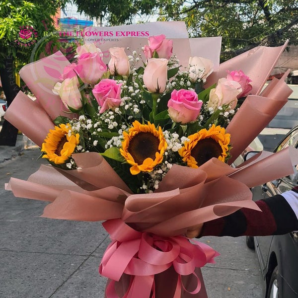 Send someone a sweet embrace with our lovely pink roses and sunflower. Beautifully arranged by our skilled florists with lush greenery fillers, 12 soft-hued blooms and 3pcs sunflowers are delivered right to the door to delight them for a special celebration or an out-of-the blue surprise.